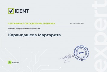 - Сертификат об освоении тренинга "Работа с конфликтными пациентами", IDENT, 2026