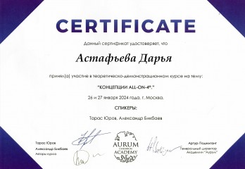 - Повышение квалификации по специальности "Стоматология ортопедическая" НГИУВ-филиал ФГБОУ ДПО РМАНПО Минздрава России 2017 г.