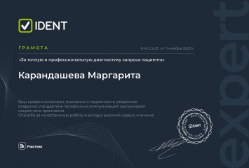 - Грамота за "Точную и профессиональную диагностику запроса пациента", IDENT, 2025